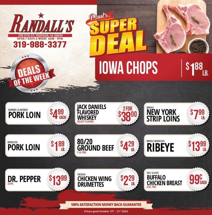 Randall’s Stop ‘N Shop is a local grocery store in Hudson, Iowa known for its great meat deals, catering and lunch specials. Our small town supermarket offers a variety of options including custom butchering, fresh produce, frozen foods, ready to eat meals and full service catering.